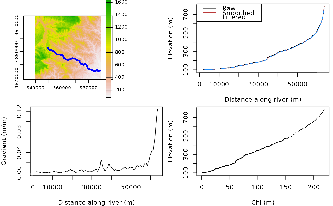 # get river data # see DEM processing vignette for example of the extraction of such data from a DEM data("rivers_cevennes",package = "gtbox") # get DEM (for plotting) data("dem_cevennes",package = "gtbox") dem = rast(dem_cevennes) rm(dem_cevennes) df = rivers_cevennes[rivers_cevennes$river==1,] # select a river df = df[order(df$dist),] # order data according to distance along river df$area = df$acc*30^2 # compute drainage area df$chi = profile_chi(df$area,df$dist,aref=1000,mn=0.5) # compute chi df$z2 = profile_smooth(df$dist,df$z,span=0.1,radius=10e3) # smooth profile df$z3 = profile_gaussian(df$dist,df$z2,span=0.1,sigma=500) # filter profile df$gradient = profile_gradient(df$dist,df$z3,window=200) # compute gradient par(mfrow=c(2,2)) plot(dem) lines(df$x,df$y,lwd=3,col="blue") par(mar = c(4,4,0.5,0.5)) plot(df$dist,df$z,type="l",xlab="Distance along river (m)",ylab="Elevation (m)") lines(df$dist,df$z2,col="firebrick") lines(df$dist,df$z3,col="dodgerblue") legend("topleft",c("Raw","Smoothed","Filtered"),lty=1,col=c("black","firebrick","dodgerblue")) plot(df$dist,df$gradient,type="l",xlab="Distance along river (m)",ylab="Gradient (m/m)") plot(df$chi,df$z,type="l",xlab="Chi (m)",ylab="Elevation (m)")
